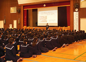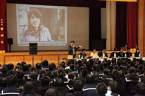 午前の部は鳥栖高校体育館にて、深川千幹さん(S55年卒業)による講演会が行われ、高校1、2年生に向けて
