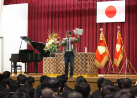 会場:鳥栖高校体育館演題:人生はチョコレート箱講師:古澤 敏文(昭和52年卒)(映画プロデューサー 北京電影学院客員教授)